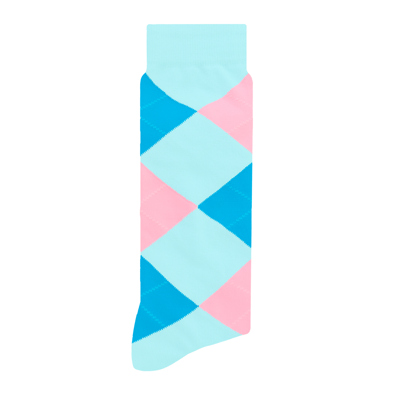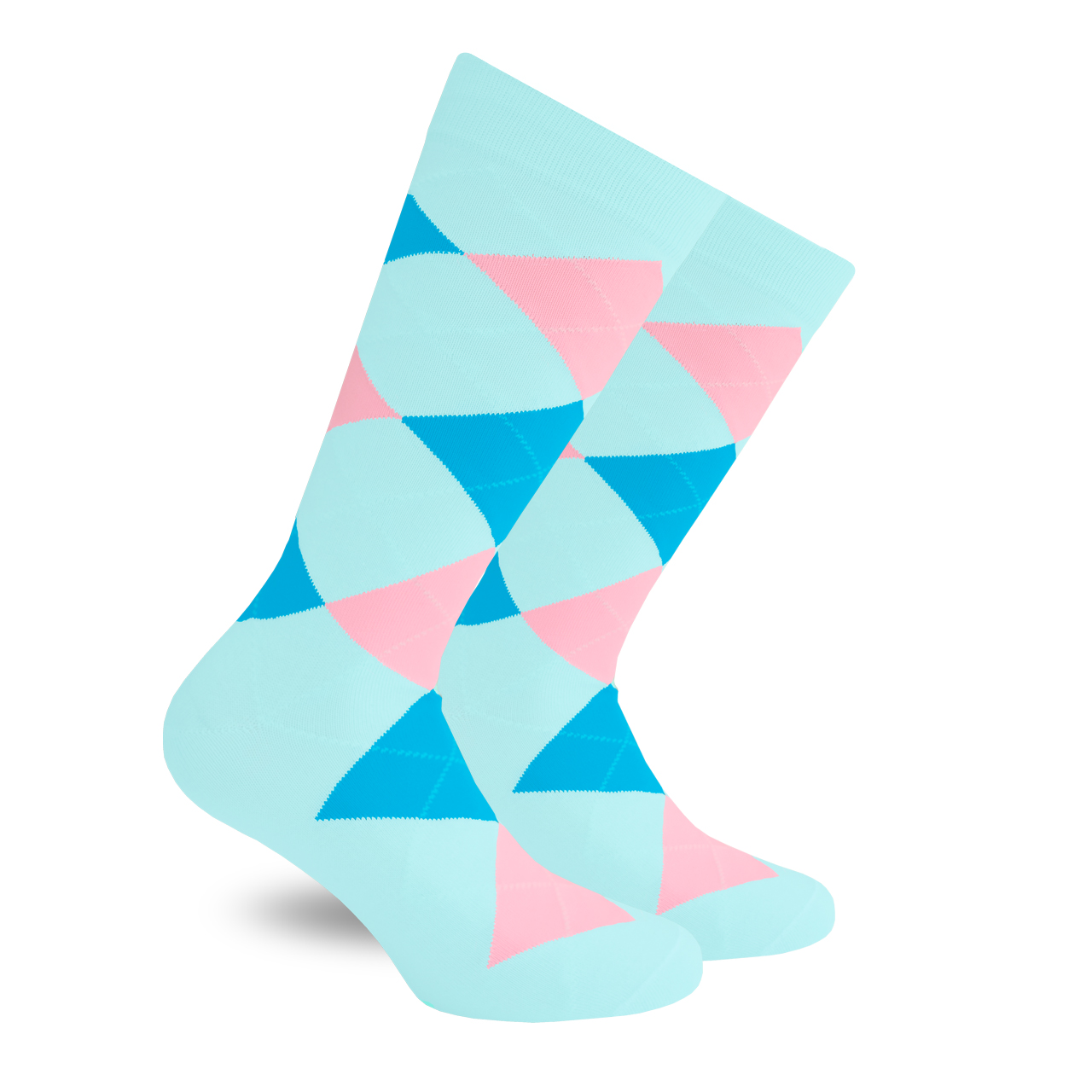 Esmoquin Azul Mezclilla es un calcetín divertido y original que combina un estampado de rombos azul cielo y  sobre un fondo azul mezclilla. Frescos, elegantes y únicos. Para eventos formales con personalidad o para levantar un outfit monocromático.