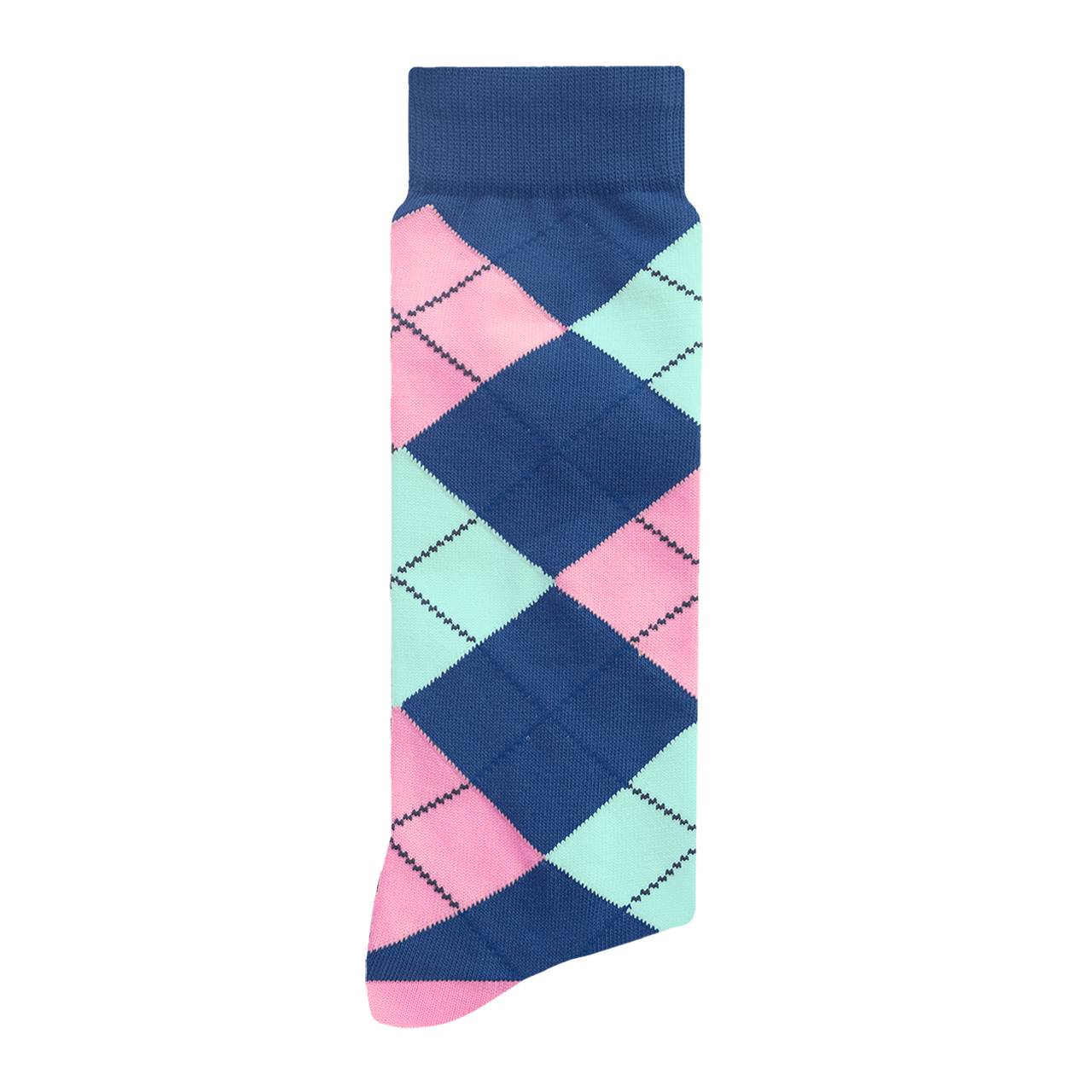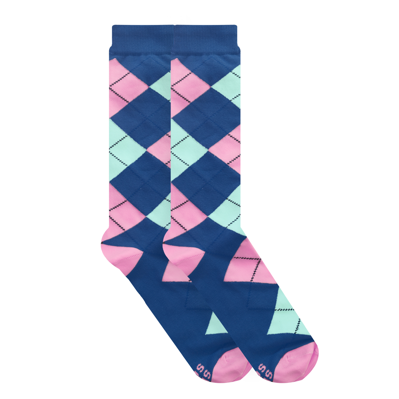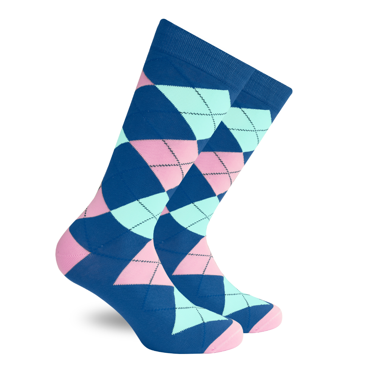 Esmoquin Azul Mezclilla es un calcetín divertido y original que combina un estampado de rombos azul cielo y  sobre un fondo azul mezclilla. Elegancia casual con textura visual. Úsalos con jeans, pantalones grises o para convertir un outfit relajado en algo más sofisticado.