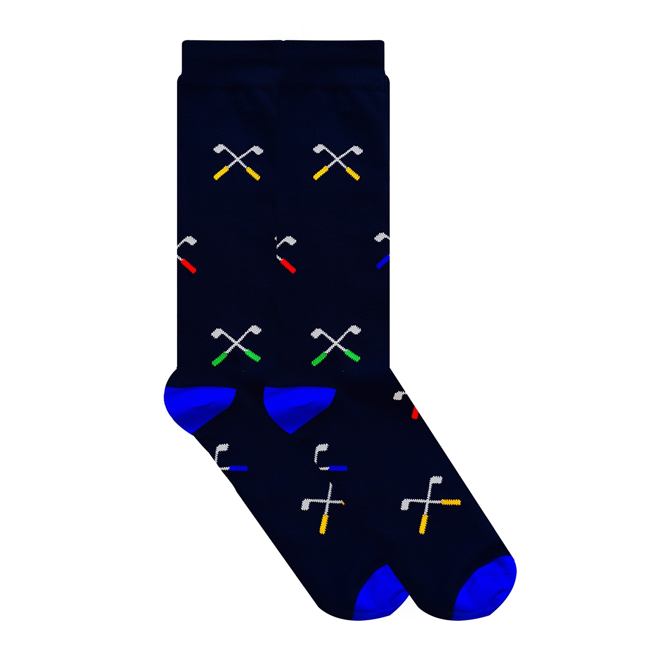 Palos de Golf es un calcetín divertido y original que combina estampados de palos de golf de colores sobre un fondo azul marino obscuro. Sutiles, sofisticados y con un aire deportivo. Para jugadores o fans del golf, o para darle un giro interesante a un outfit de trabajo.